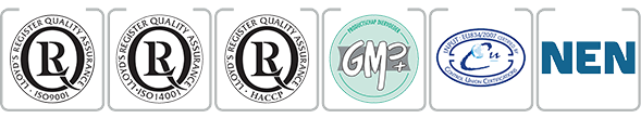 Gecertificeerd: geproduceerd conform ISO 9001, ISO 14001, HACCP, GMP+, EKO/SKAL en NEN.